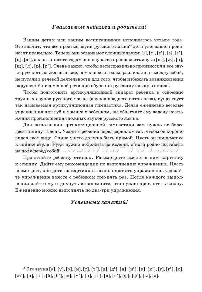 Чтобы подготовить артикуляционный аппарат ребенка к освоению трудных звуков русского языка (звуков позднего онтогенеза), существует так называемая артикуляционная гимнастика. Делая ежедневно веселые упражнения для губ и язычка с ребенком, вы облегчите ему задачу постижения произношения сложных звуков русского языка.