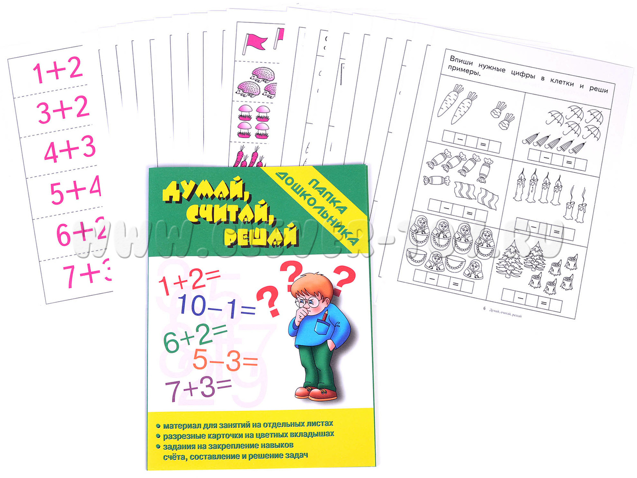 Папка дошкольника поможет ребенку закрепить навыки счета, решать примеры и задачи на сложение и вычитание, составлять задачи на сложение и вычитание.