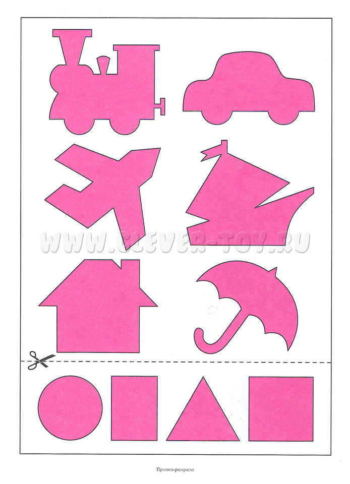 Картинки на цветном вкладыше необходимо разрезать по пунктирным линиям. Получится несколько трафаретов, которые можно обводить, а потом раскрасить или заштриховать.