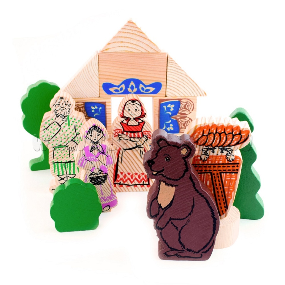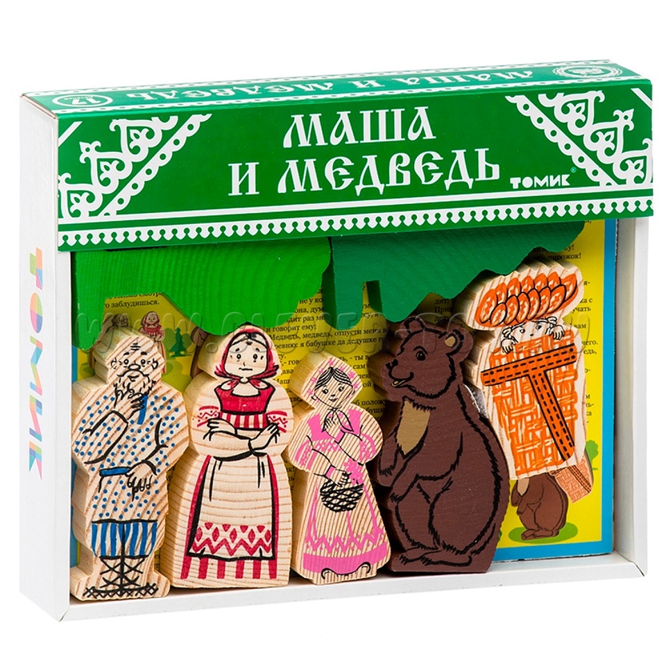 В набор входят деревянные модели персонажей и декорации сказки "Маша и медведь" (всего 15 деталей), а также вкладыш с текстом сказки.