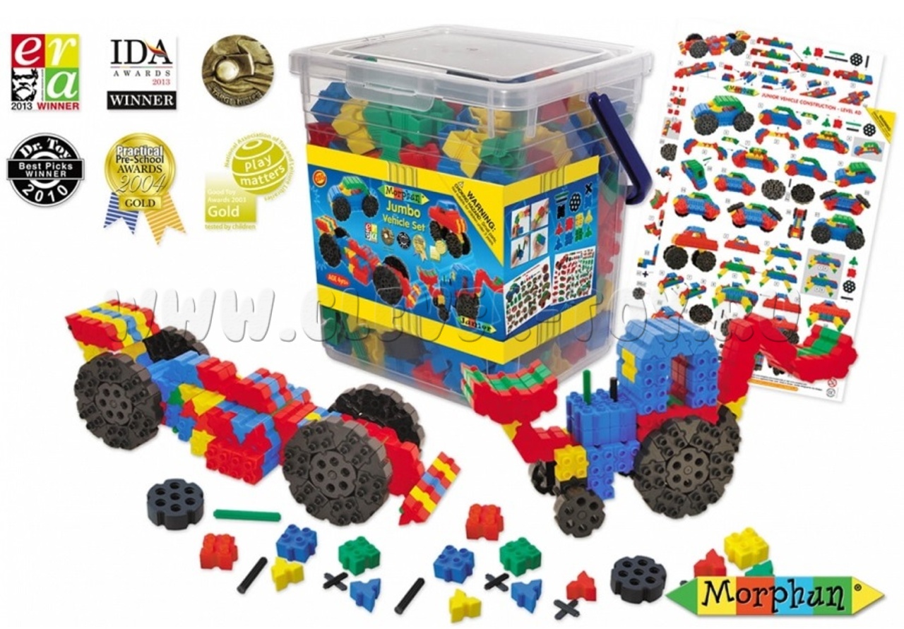 Конструктор Morphun Jumbo Vehicles Set упакован в ударопрочный прозрачный пластиковый короб с крышкой и удобной ручкой для переноски и хранения деталей.