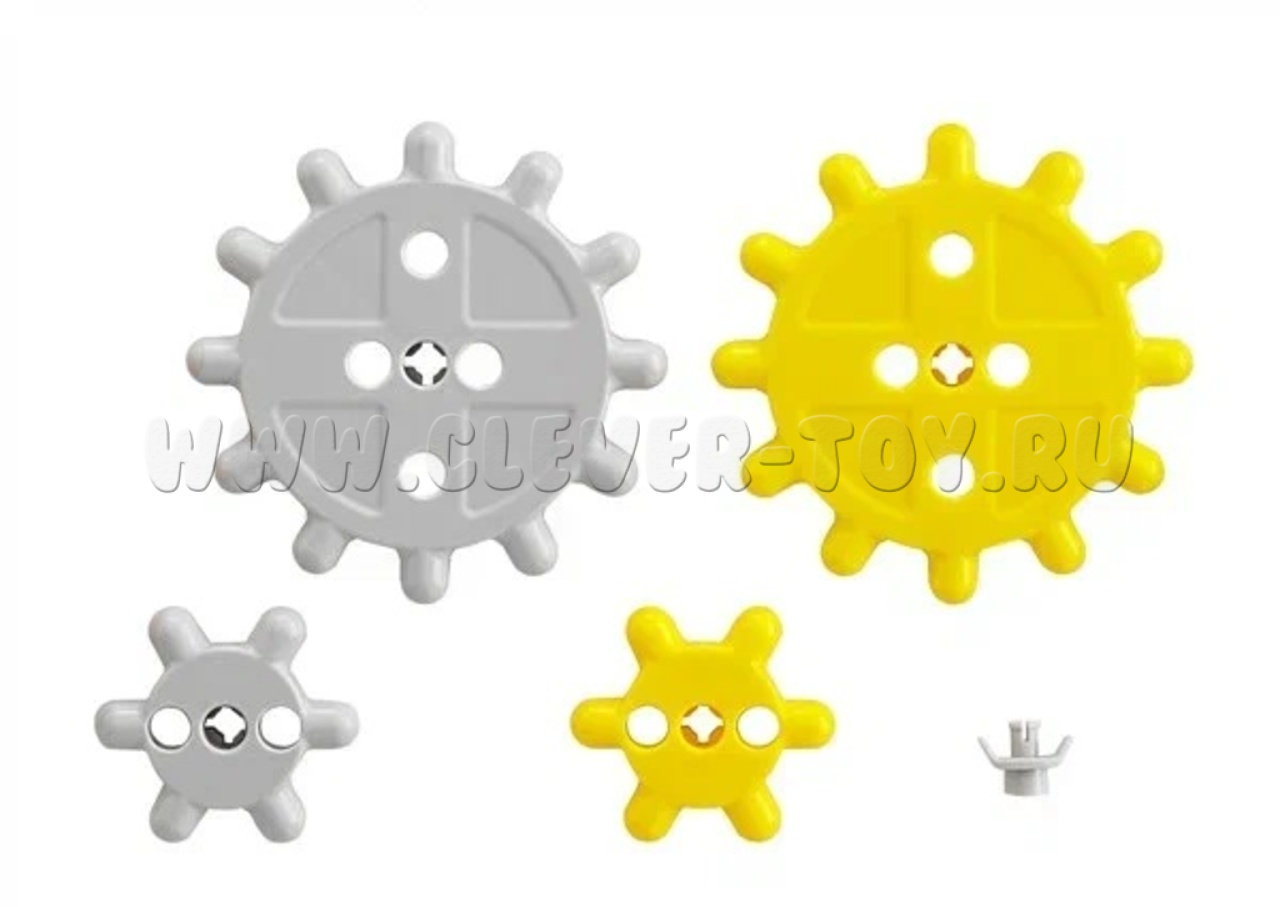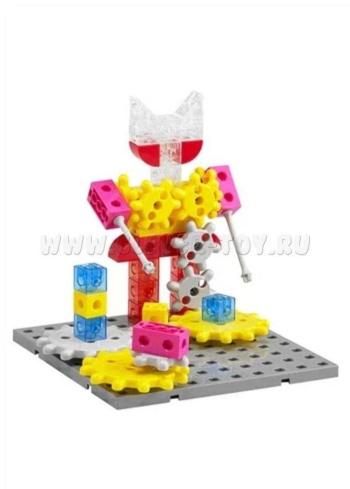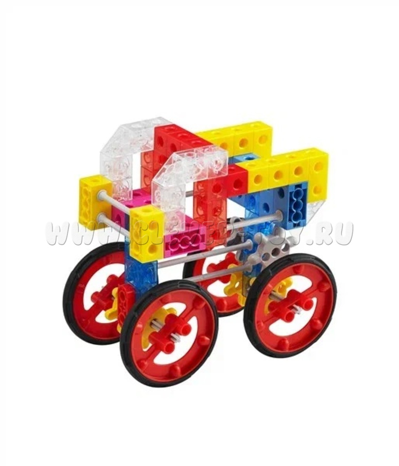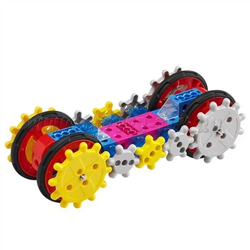 Набор включает в себя 117 деталей (кубики, шестеренки, оси, основание для кубиков и др.), а также инструкция на англ. яз. Размер самой длинной детали 9 см.