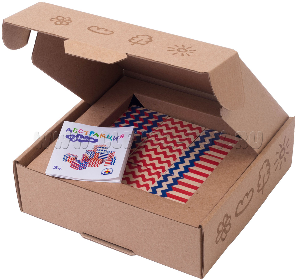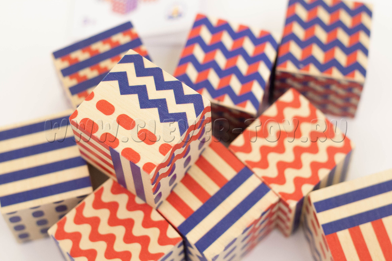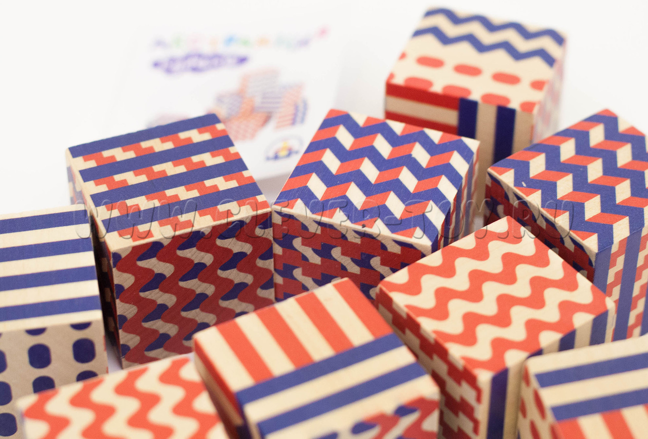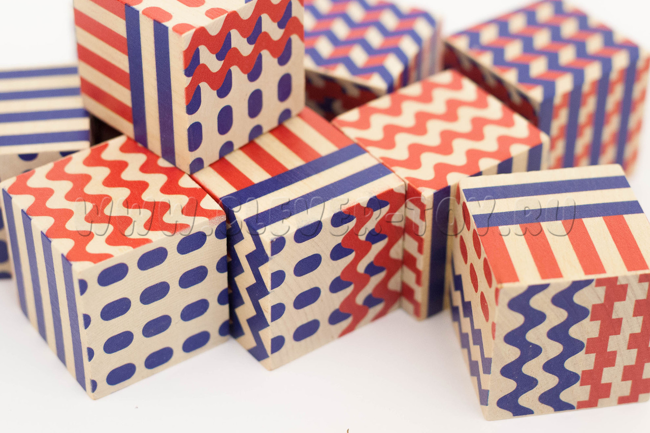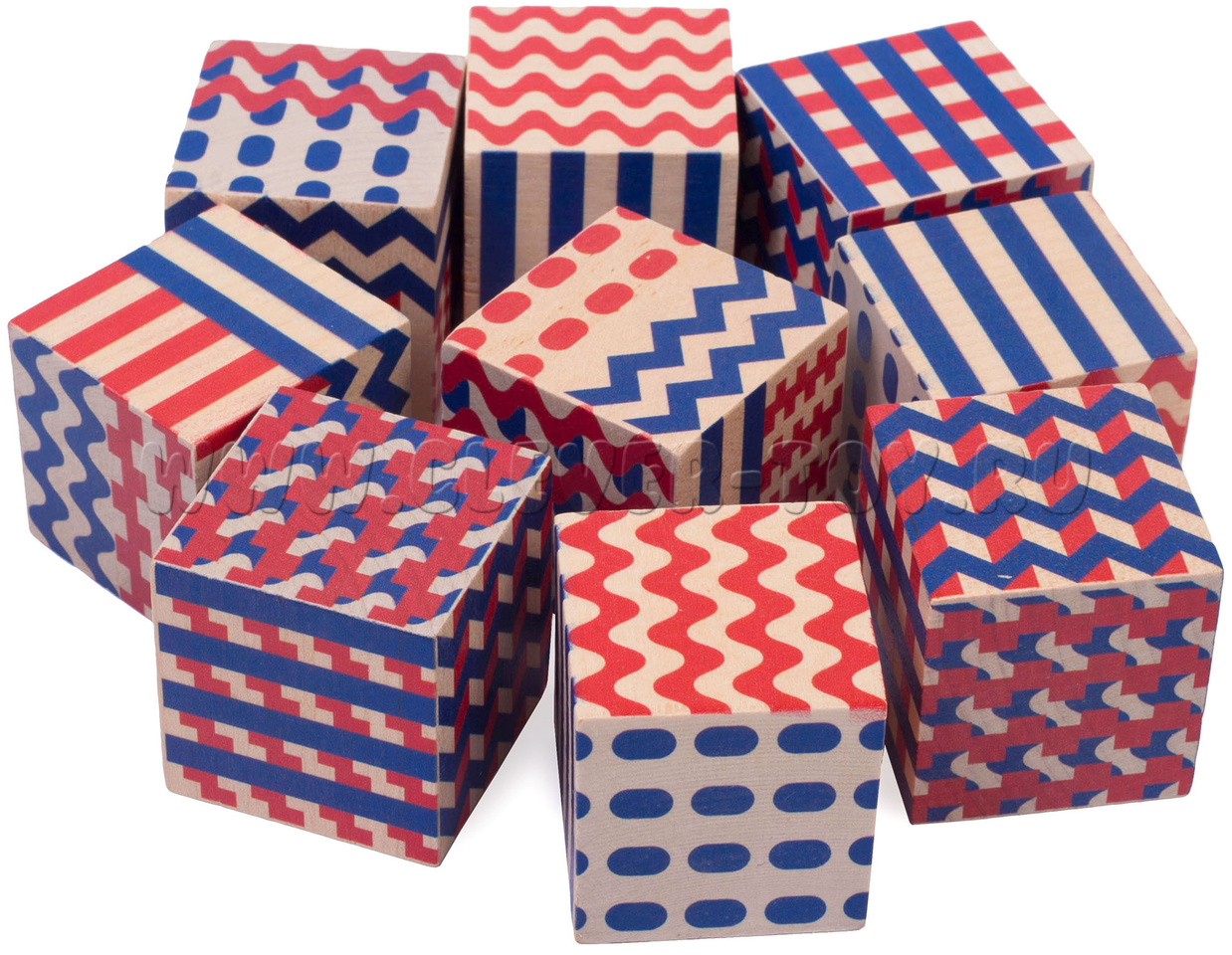 9 кубиков, на каждой грани которых с помощью специального станка нанесена яркая картинка: волнистые, прямые, пунктирные и другие линии красного и синего цвета, которые легко складываются в разнообразные узоры.