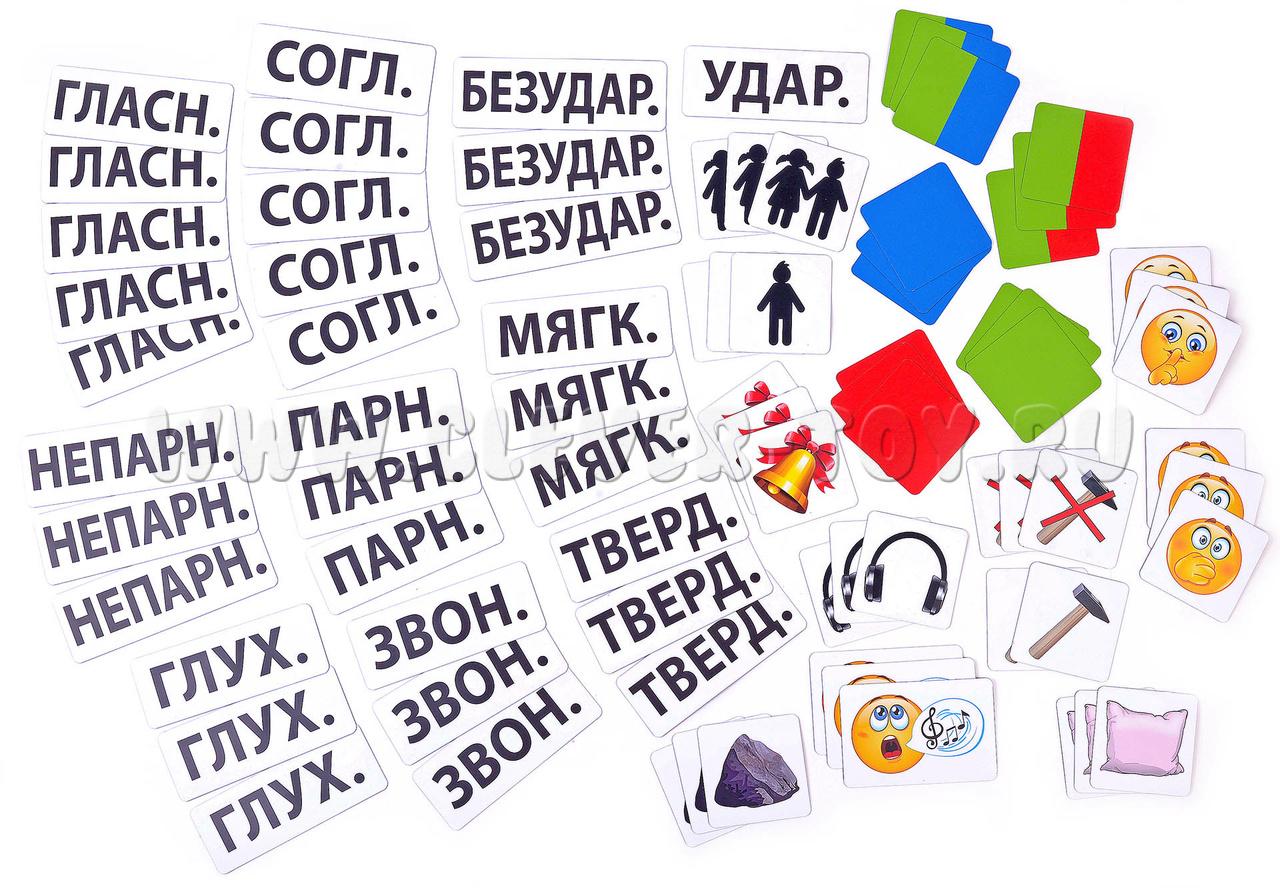 - Цветные карточки, обозначающие гласные, согласные мягкие, согласные, которые могут быть мягкими и твердыми, и ударные гласные – по 3 шт.