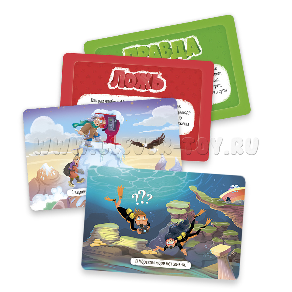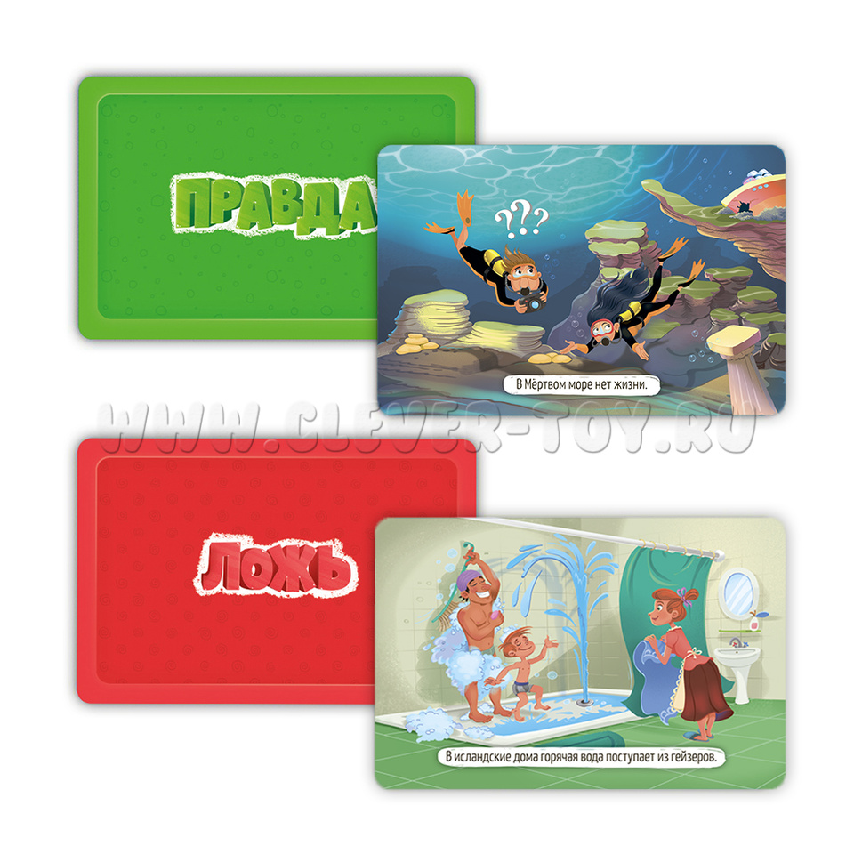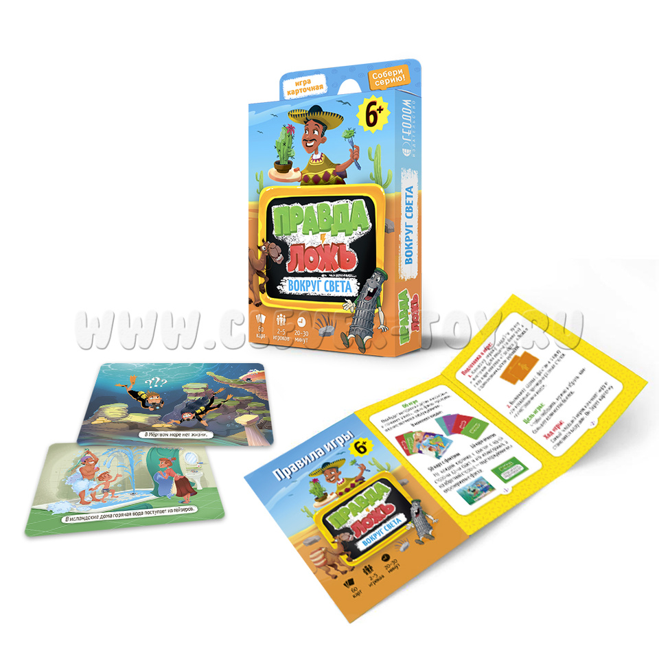 Познавательная карточная игра с 50 фактами и "обманками" о странах и их жителях, красочные иллюстрации.