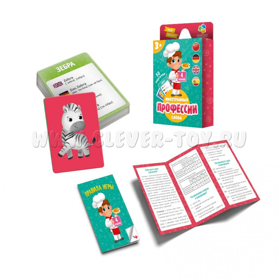 Каждая карточка с одной стороны содержит яркую, крупную картинку, которую легко воспринимать малышам от 3-х лет, или прилагательное, с другой стороны – слово на русском языке и 4 его перевода на самые распространённые мировые языки с транскрипцией на латинице и кириллице.