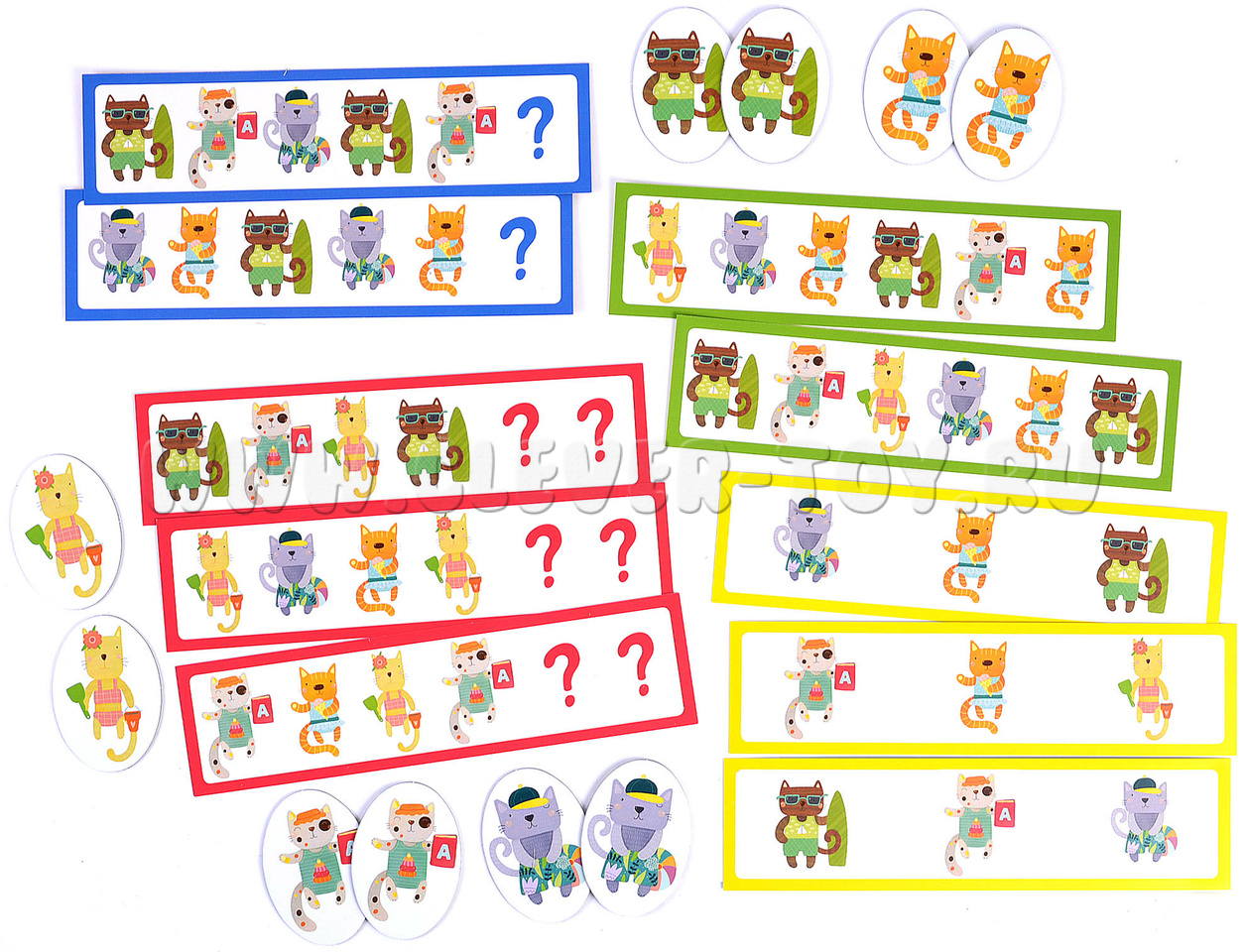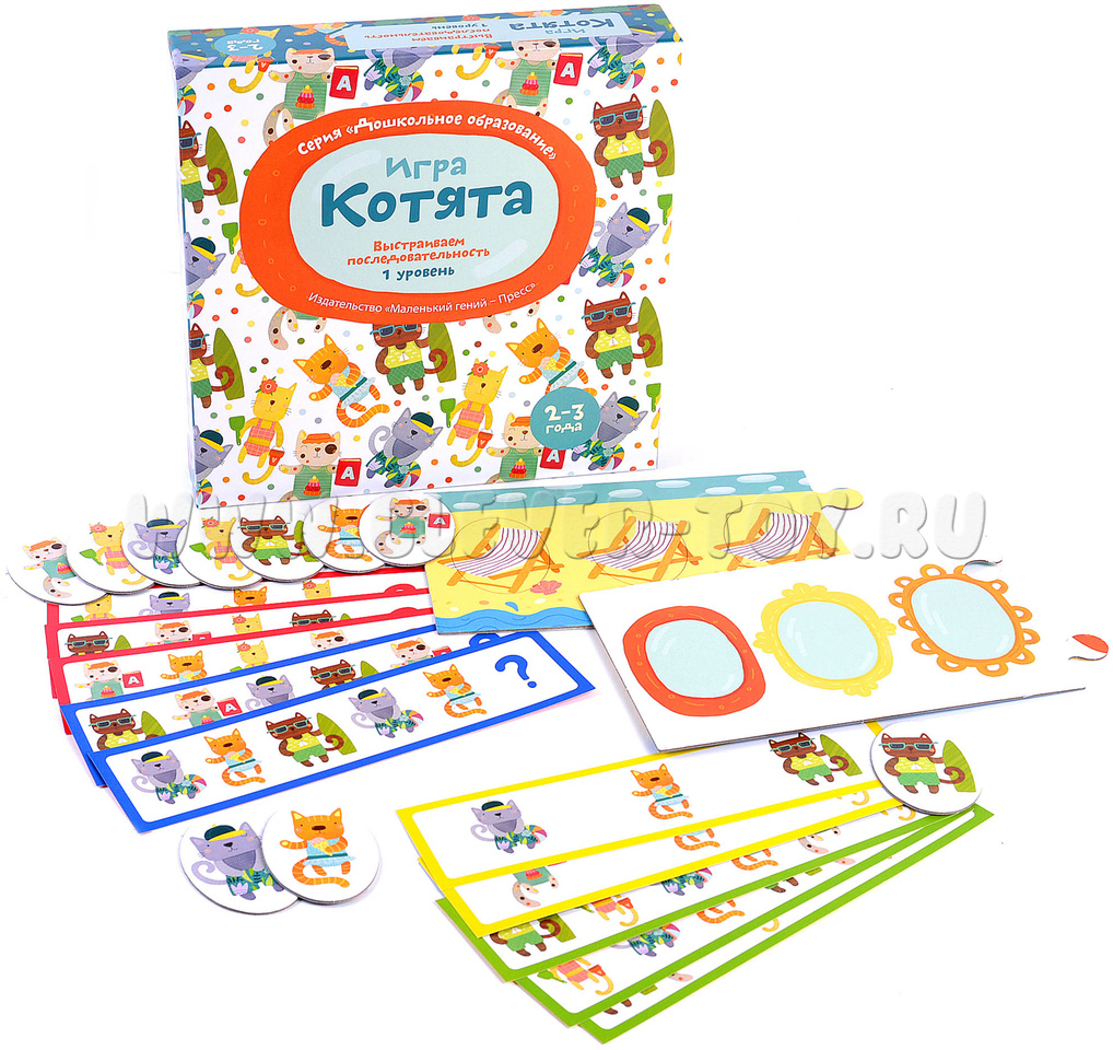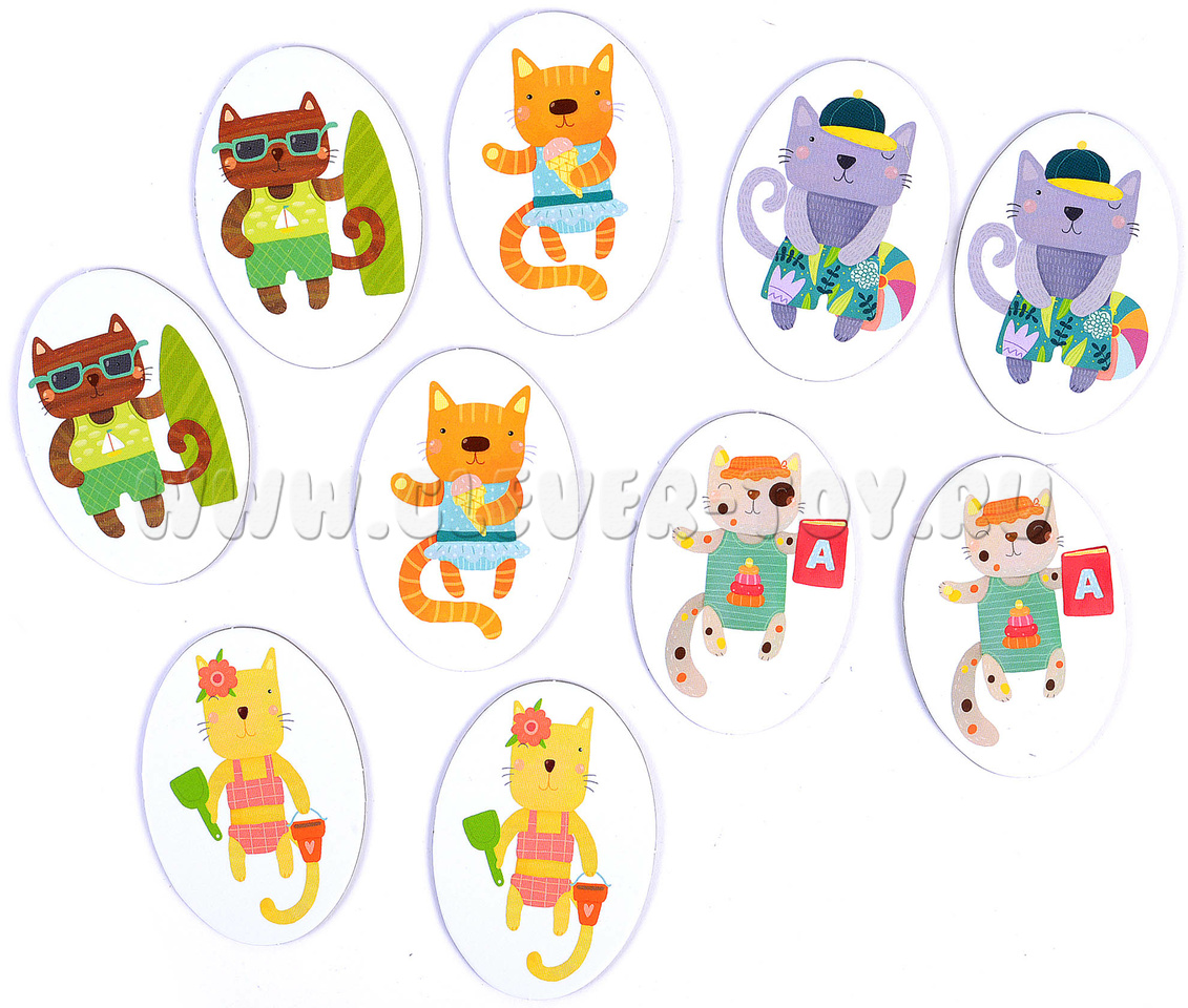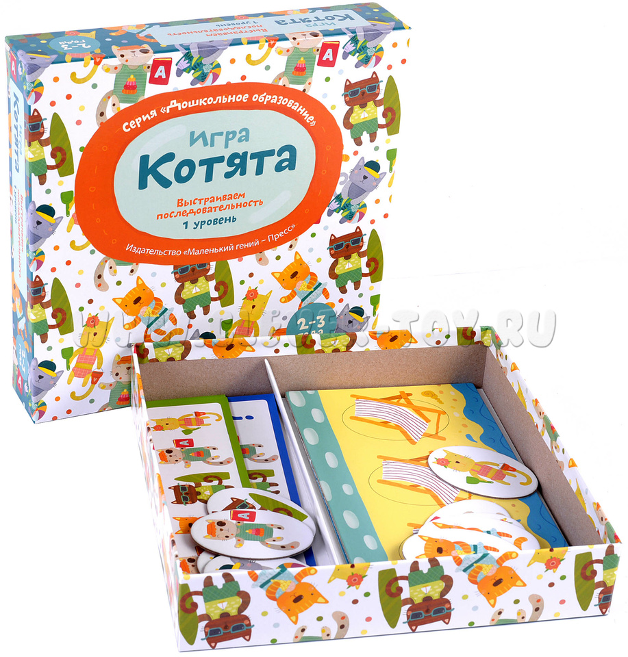 В набор входят 2 части игрового поля, 5 пар (всего 10 шт.) фишек с котятами, 10 двухсторонних карточек с заданиями разной степени сложности (по 5 штук на каждую).