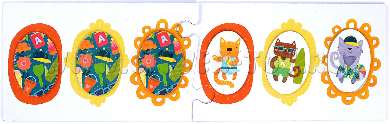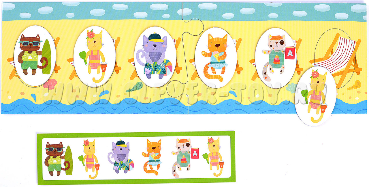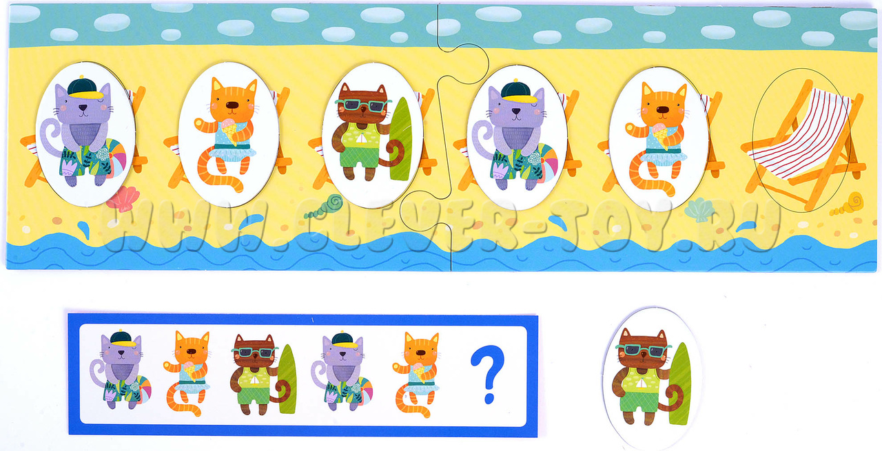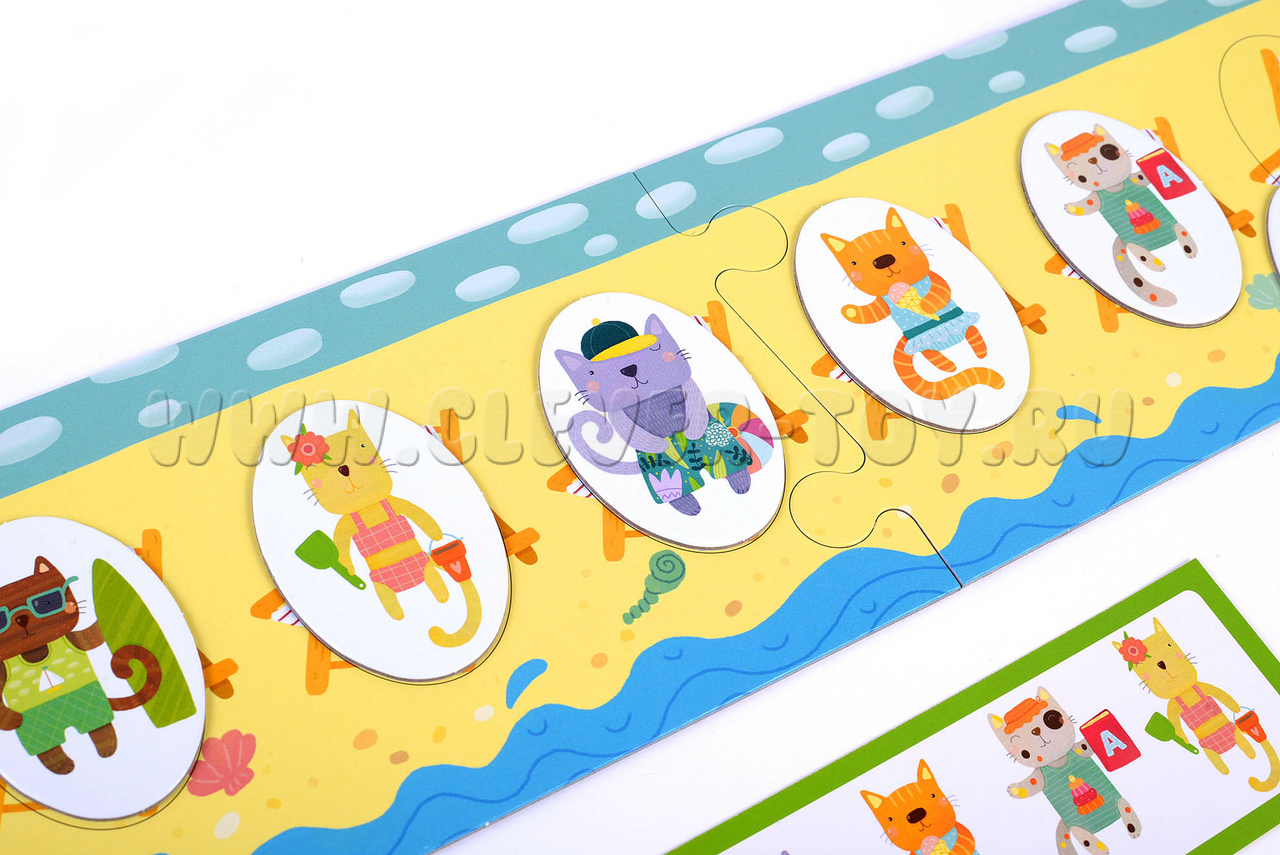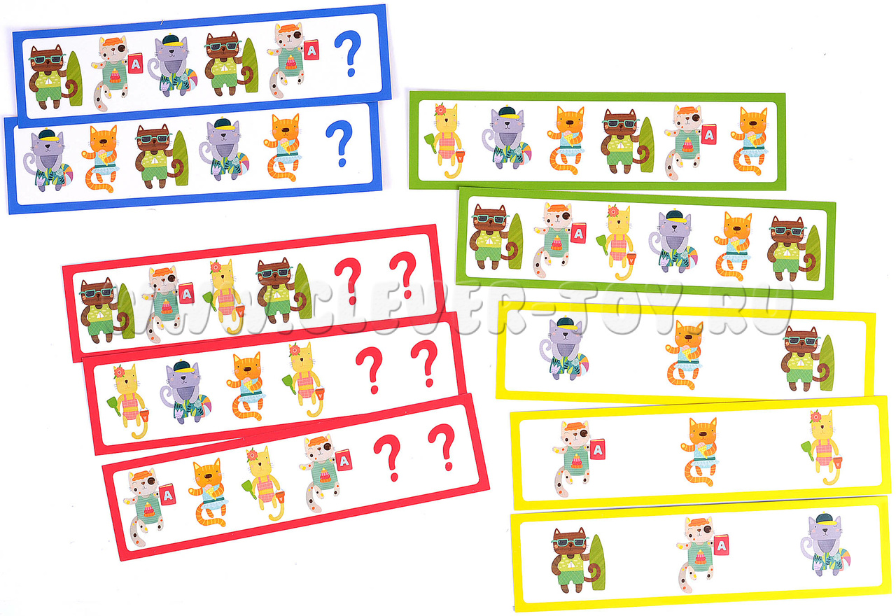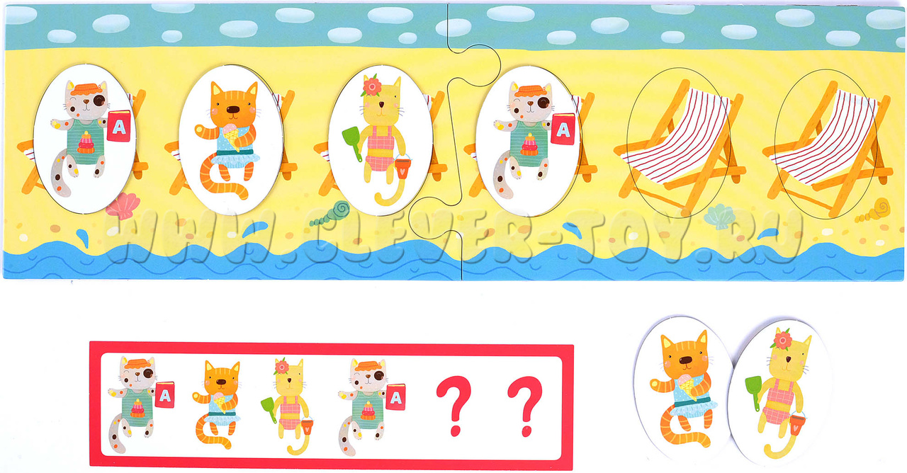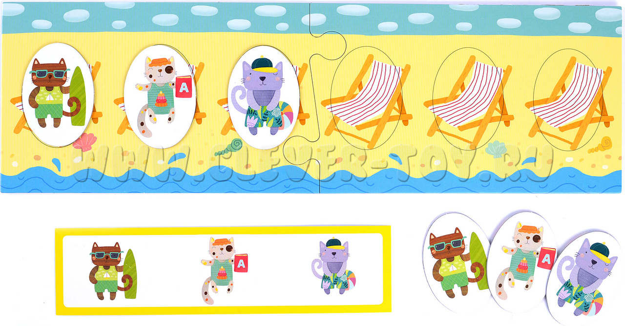2. Игра для поля с шезлонгами (обратная сторона игрового поля). Начинайте с заданий в зеленой рамке: воспроизводите заданную карточкой последовательность котят. Более сложные задания предлагают не только продолжить ряд, но и установить взаимосвязь и закончить последовательность самостоятельно. К этим заданиям стоит переходить, когда малыш уверенно справляется с зелеными карточками.