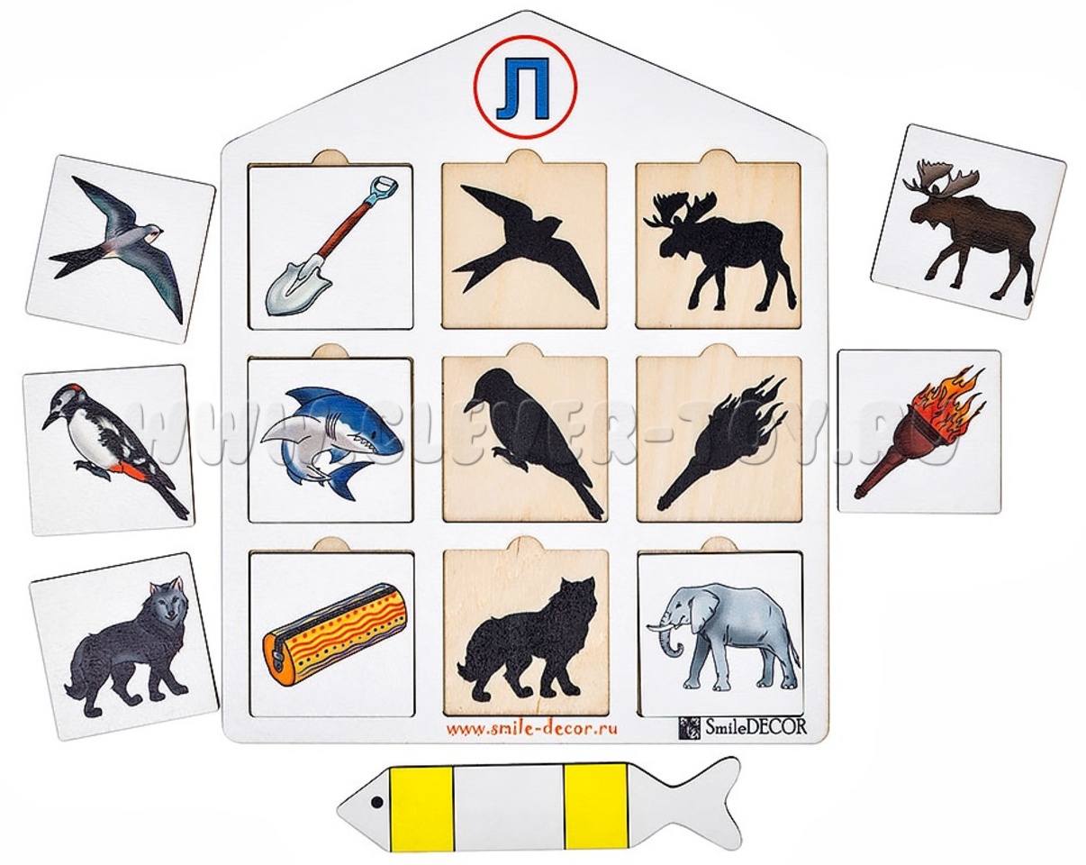 1. Назови картинку. Найди её квартирку в домике. (Ребёнок подбирает картинку к тени и «заселяет» её в домик.)