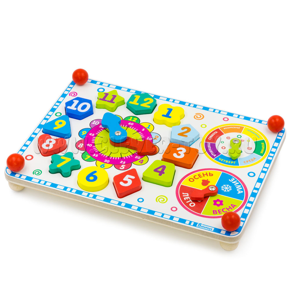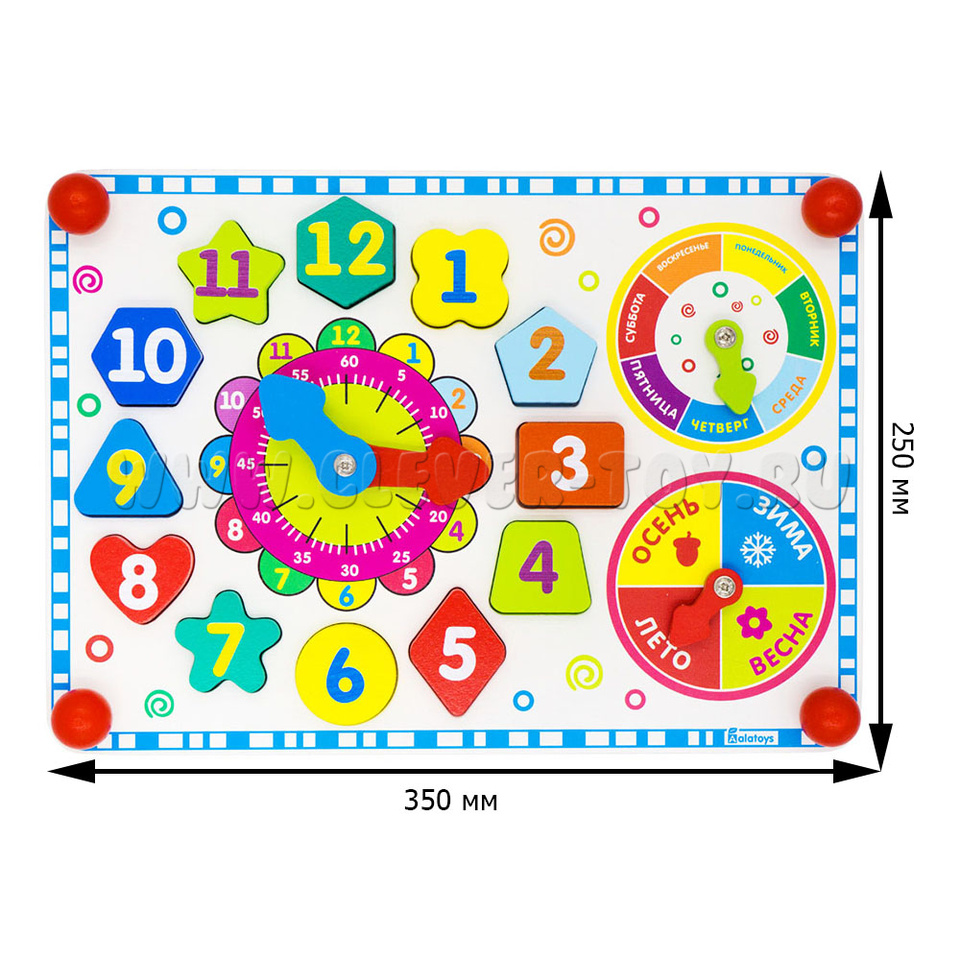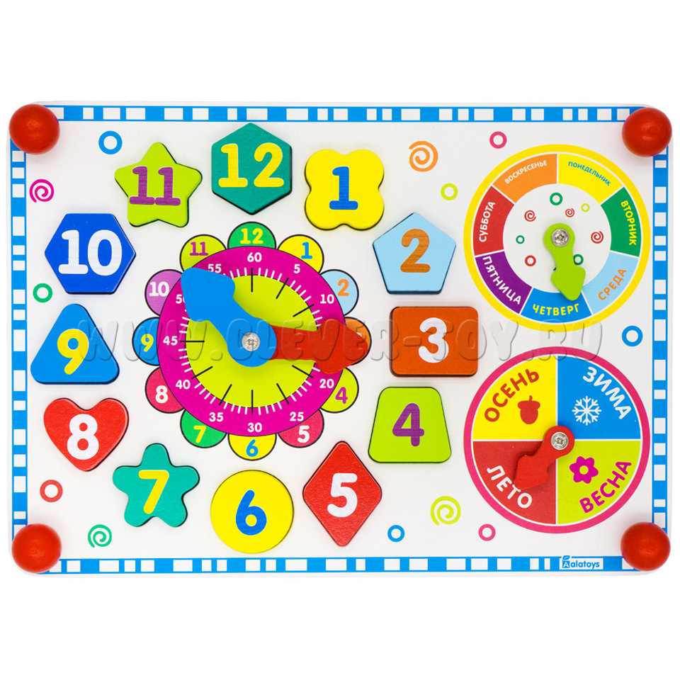 Внешний круг – с цифрами от 1 до 12 –обозначает часы, внутренний круг - с цифрами 5,10,15,20,25,30,35,40,45,50,55,60 – обучит ребёнка обозначению минут в часе. Также познакомит с секундами. В центре круга – вращающиеся стрелки (синяя маленькая – часовая, большая красная – минутная и секундная).