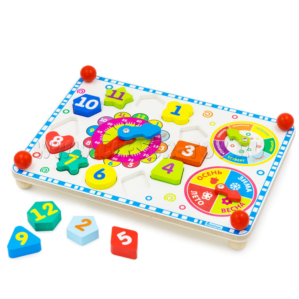 Фигуры расположены вокруг циферблата. С обозначением цифр от 1 до 12, разной формы и разных цветов. Поможет малышу познакомиться с геометрическими фигурами, развить логику, мелкую моторику.