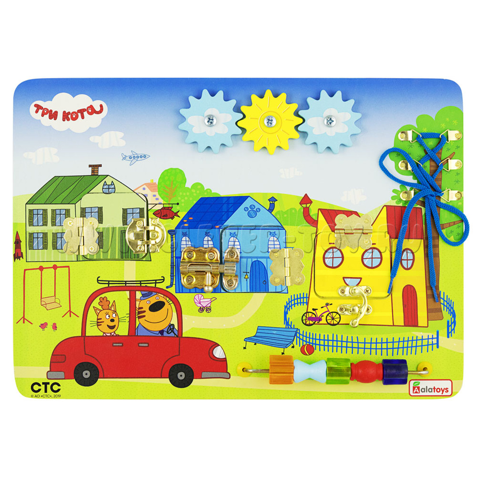 Красочный и позитивный бизиборд "Где живут коты" (лицензионный бренд "ТРИ КОТА"), созданный по методике Монтессори, развивает навыки шнурования, мелкую моторику, воображение, логику и речь. Герои любимого мультфильма обязательно помогут в этом!