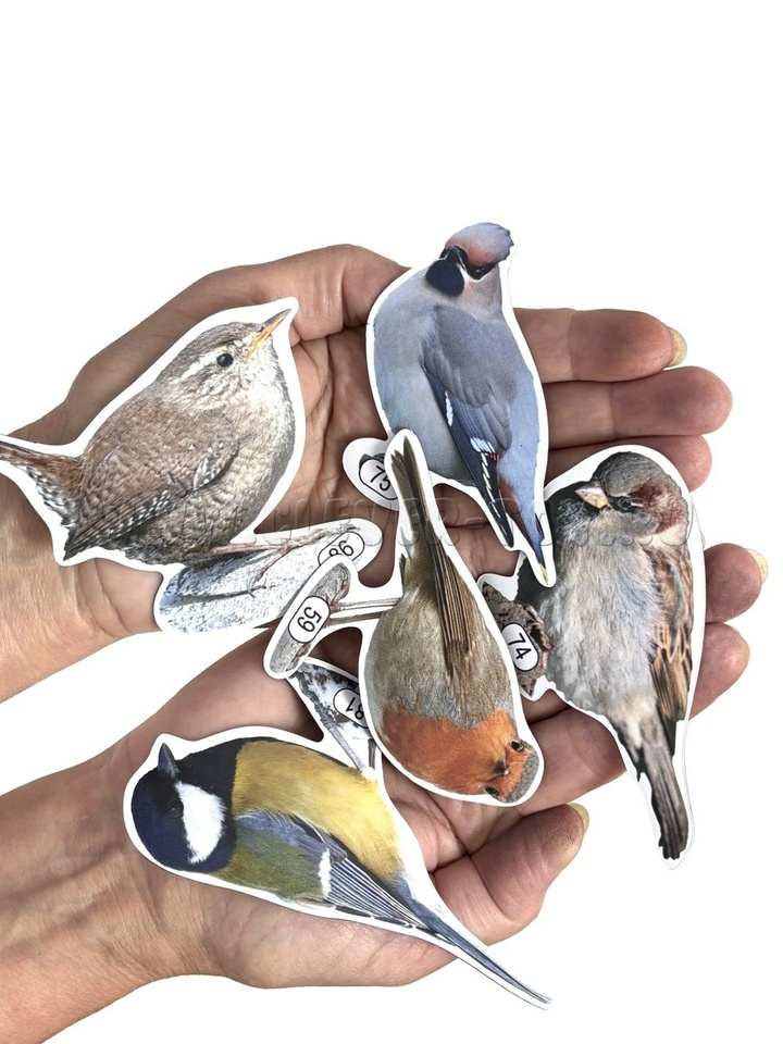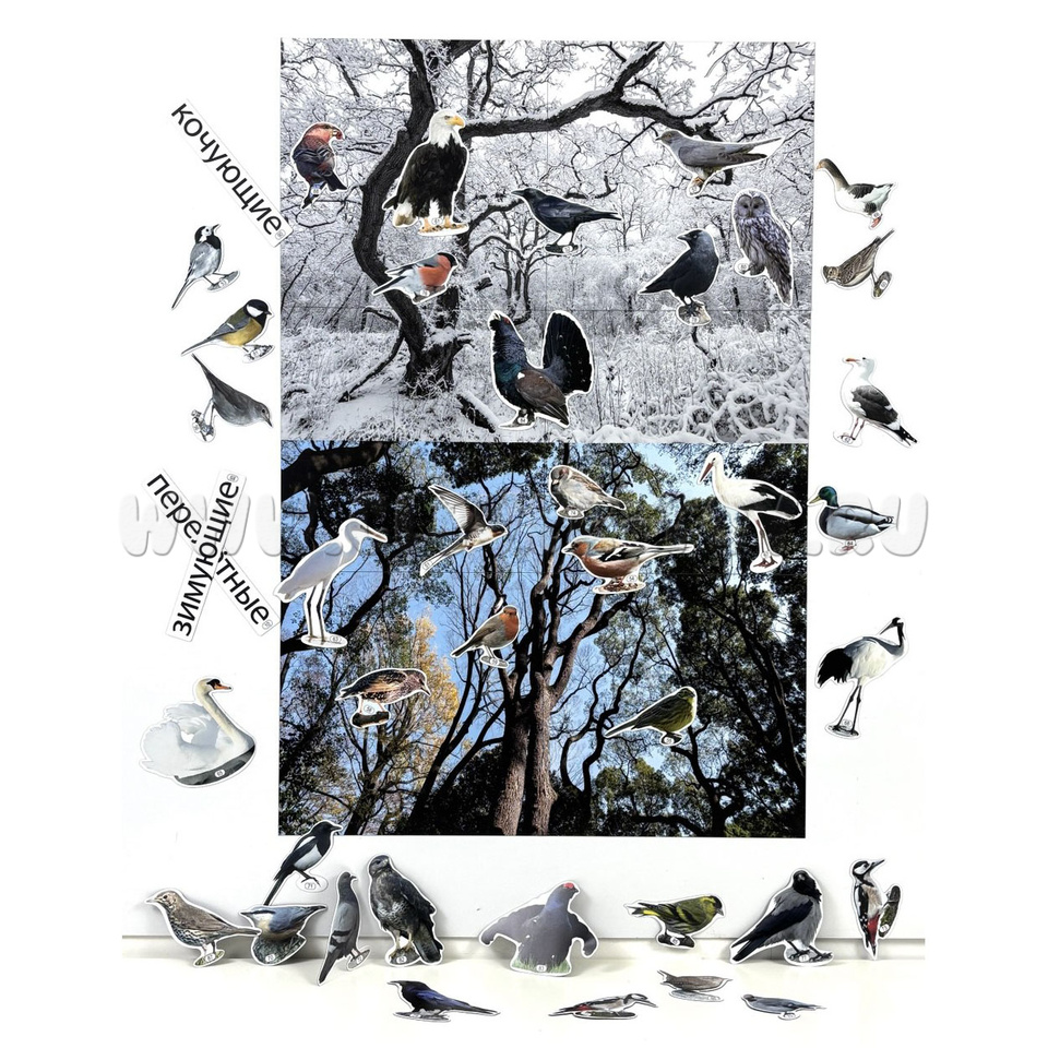 В комплекте к плакату идут магнитные карточки, объединённые по разным темам: "Кто такие птицы?", "Как помочь птицам зимой? Развешиваем кормушки", "Что едят птицы зимой?", "Перелётные птицы" и другие.