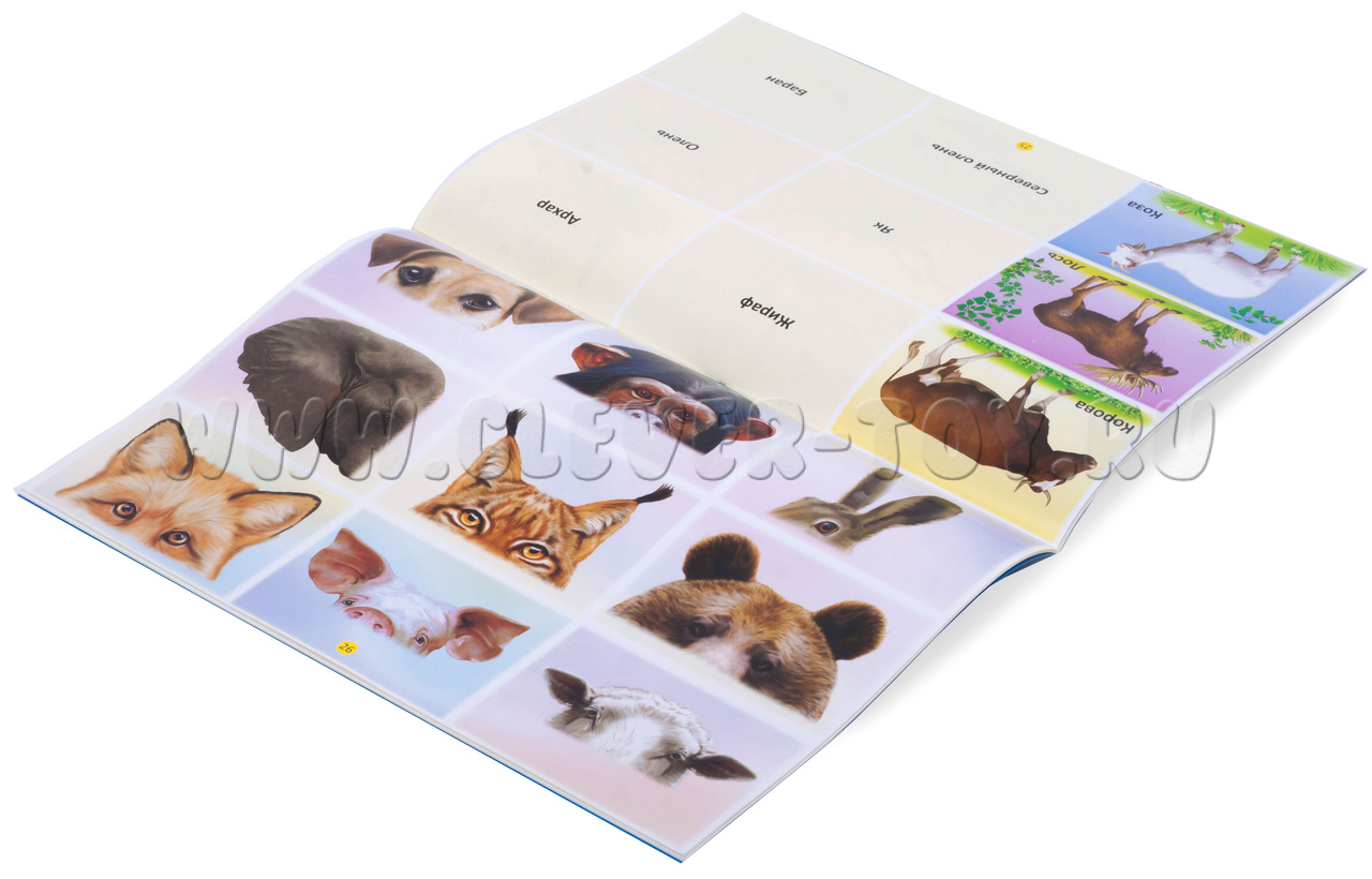 • знакомит ребёнка с представителями животного мира (щука, баран, заяц, лошадь, гусь, лиса, белка, свинья, ёж, лягушка, дикобраз, орёл, хорёк, леопард, скунс, панда, лев, енот, тигр и др.);