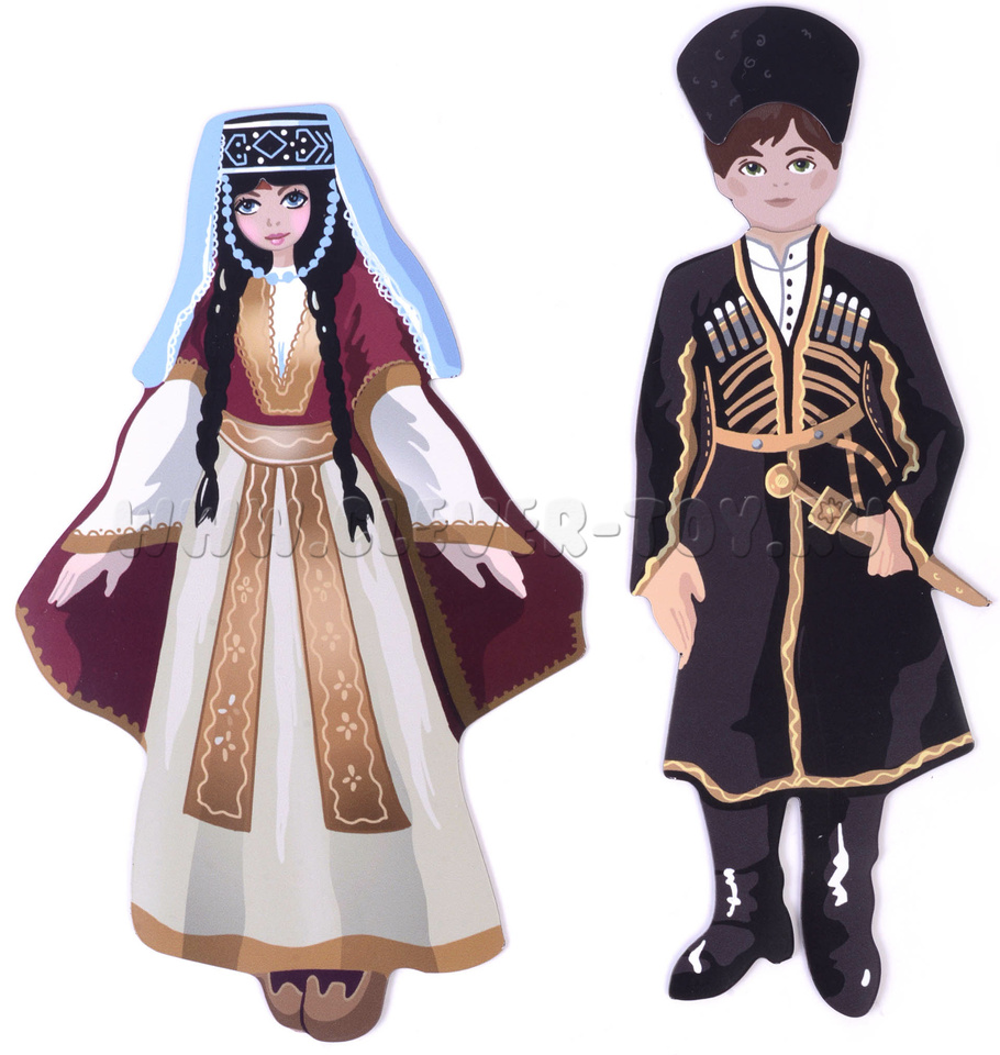 В наборе – магнитные мальчик и девочка в купальных костюмах (кстати, кукол можно крепить на магнитной доске) и шесть вариантов национальных костюмов: русского, украинского, грузинского, узбекского, греческого, арабского.