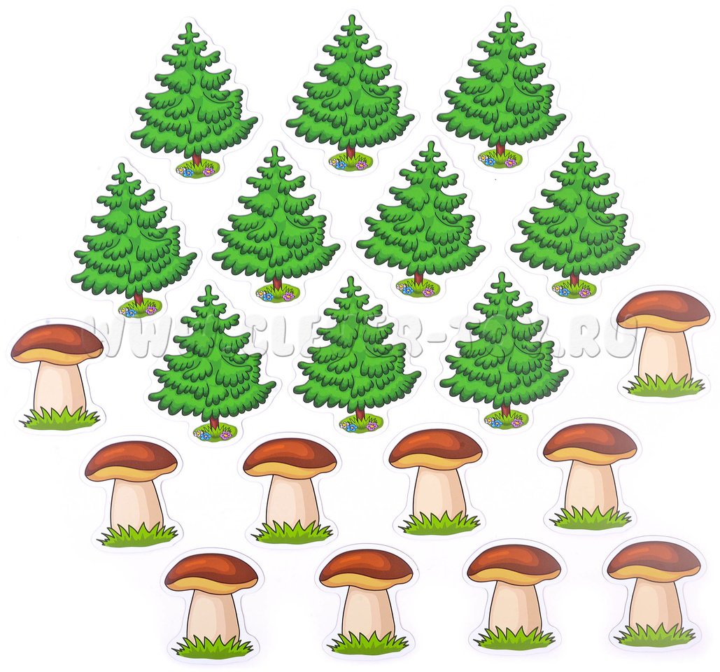 В наборе двадцать магнитных карточек: 10 ёлочек и 10 грибов. Карточки гнутся и не ломаются, моются под краном.