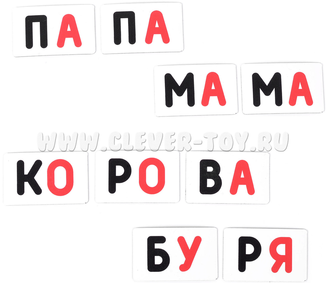 200 магнитных карточек со слогами и буквами.
