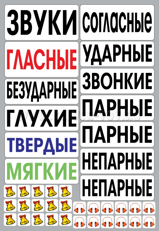 Чтобы не запутаться в звуках, которых в русском языке гораздо больше, чем букв, можно постараться наглядно представить себе их смысловые группы. Делая первые шаги на пути представление русской фонетики в понятном ребенку виде, мы выпустили большие магнитные карточки с классификацией звуков и магнитными колокольчиками для обозначения звонких согласных. В наборе 40 магнитов. Карточки со словами имеют размер 14х7 см, а маленькие карточки с картинками — 2,5х2,5 см.