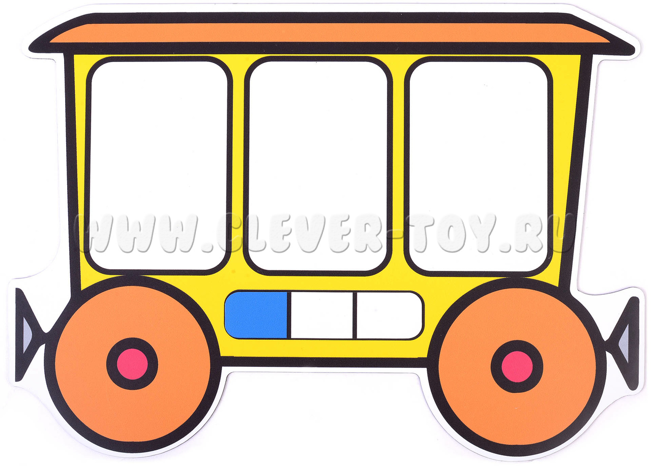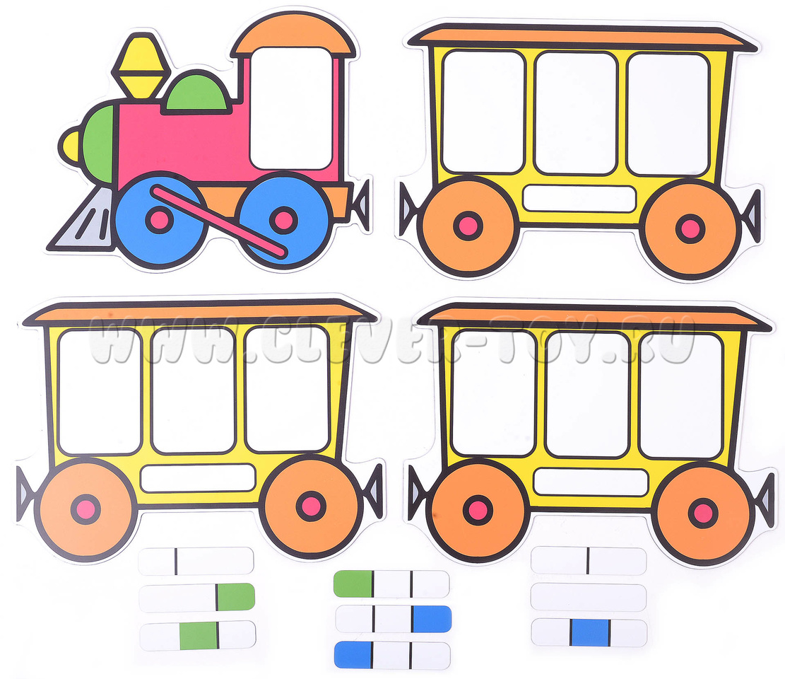 В основе игры - поезд с тремя вагонами, на который можно выкладывать карточки с буквами, схемами и иллюстрациями. В зависимости от задания, в окна поезда и вагонов можно помещать карточки с иллюстрациями.