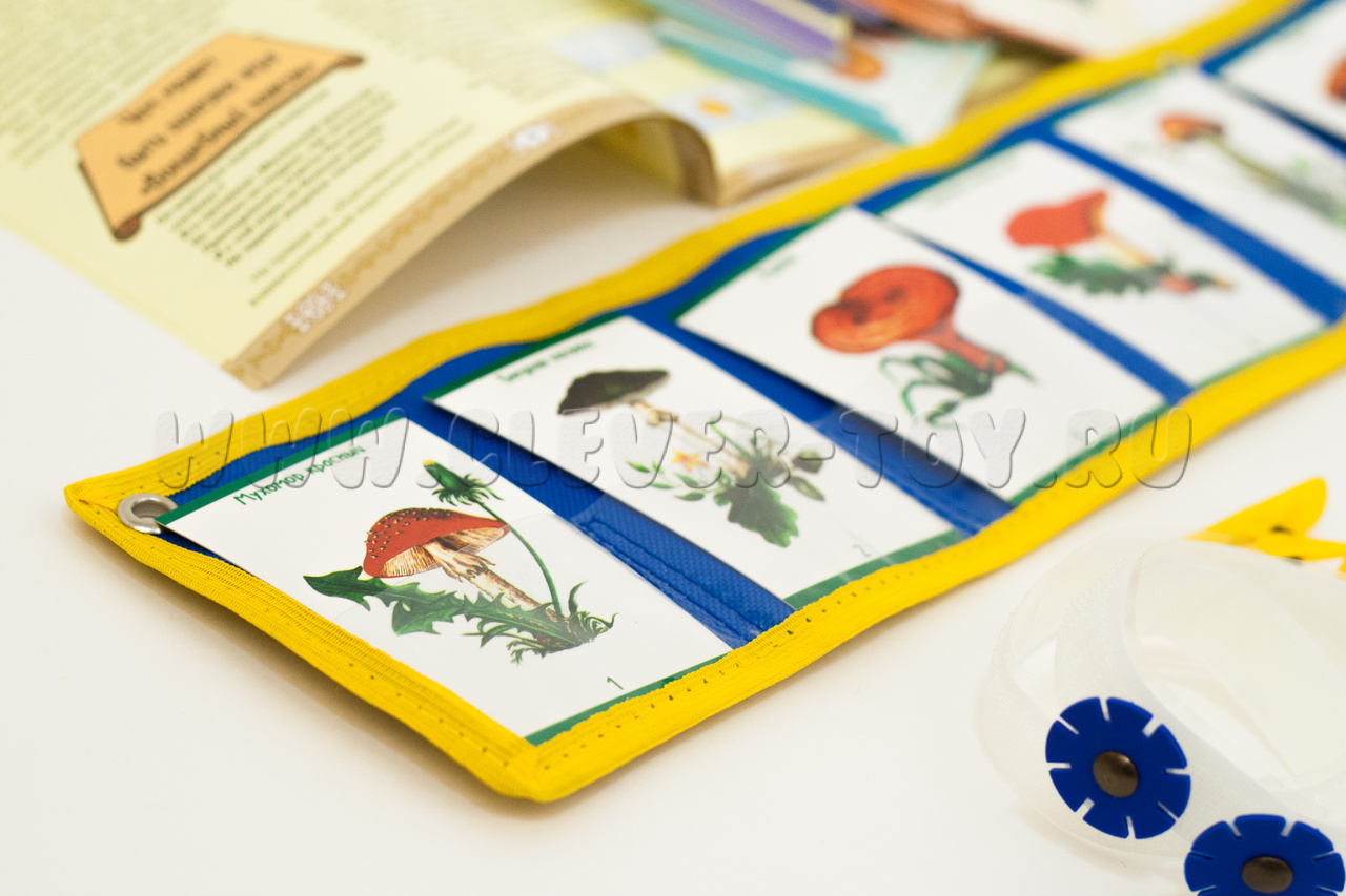 - 5 комплектов тематических картинок – «Геометрические фигуры», «Часы», «Грибы», «Транспорт», «Животные» - всего 50 карточек;