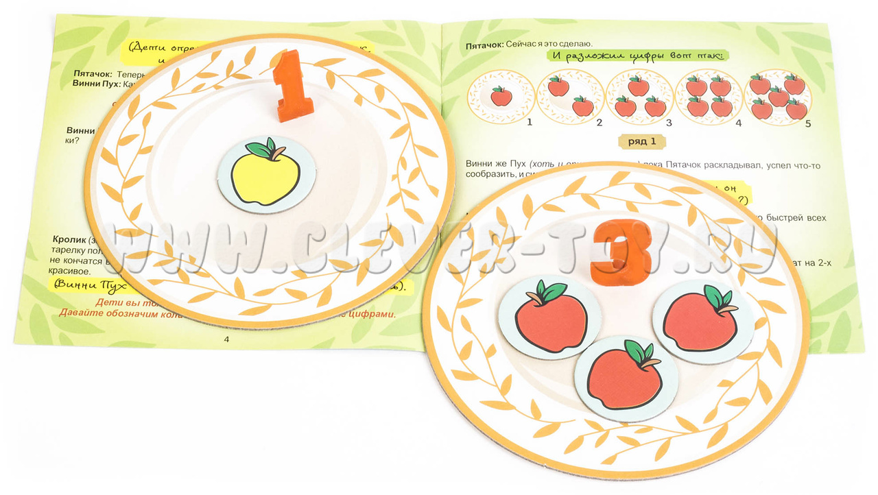 В пособии используется счётный материал, удобный для действия и хорошо знакомый детям – яблоки 2-х цветов. Инструкция, входящая в набор, поможет родителям стать настоящими волшебниками и проводниками в мир математики. В пособии использованы задачи Ж.Пиаже на установление независимости чисел от пространственных признаков, а также элементы ментальной математики.