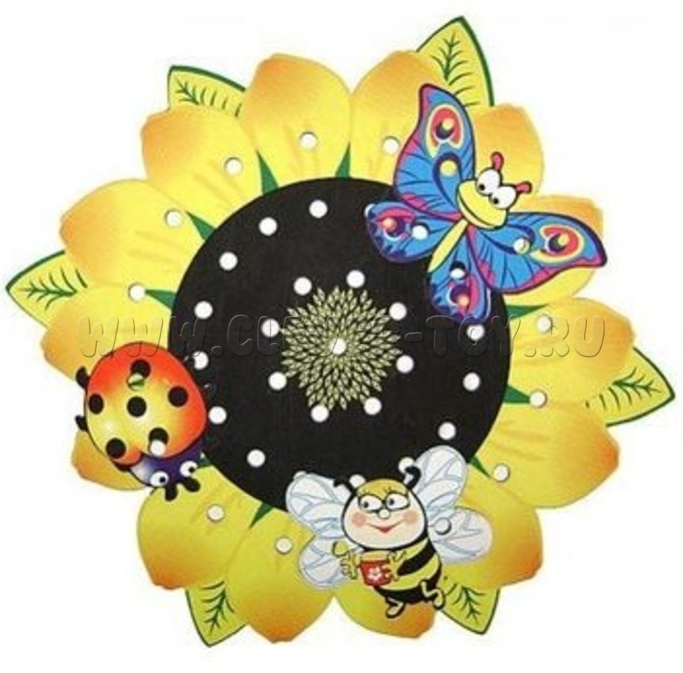 Играя в шнуровку-подсолнух, вы можете придумать сказку, о том откуда прилетел на него листик, или же как на него заползла улитка, для чего на него прилетела пчела? и другое.