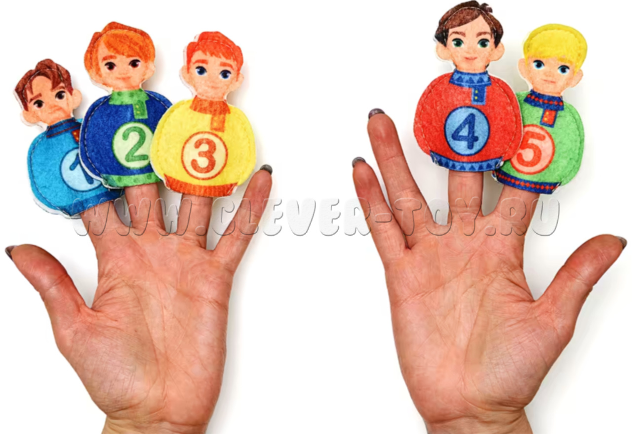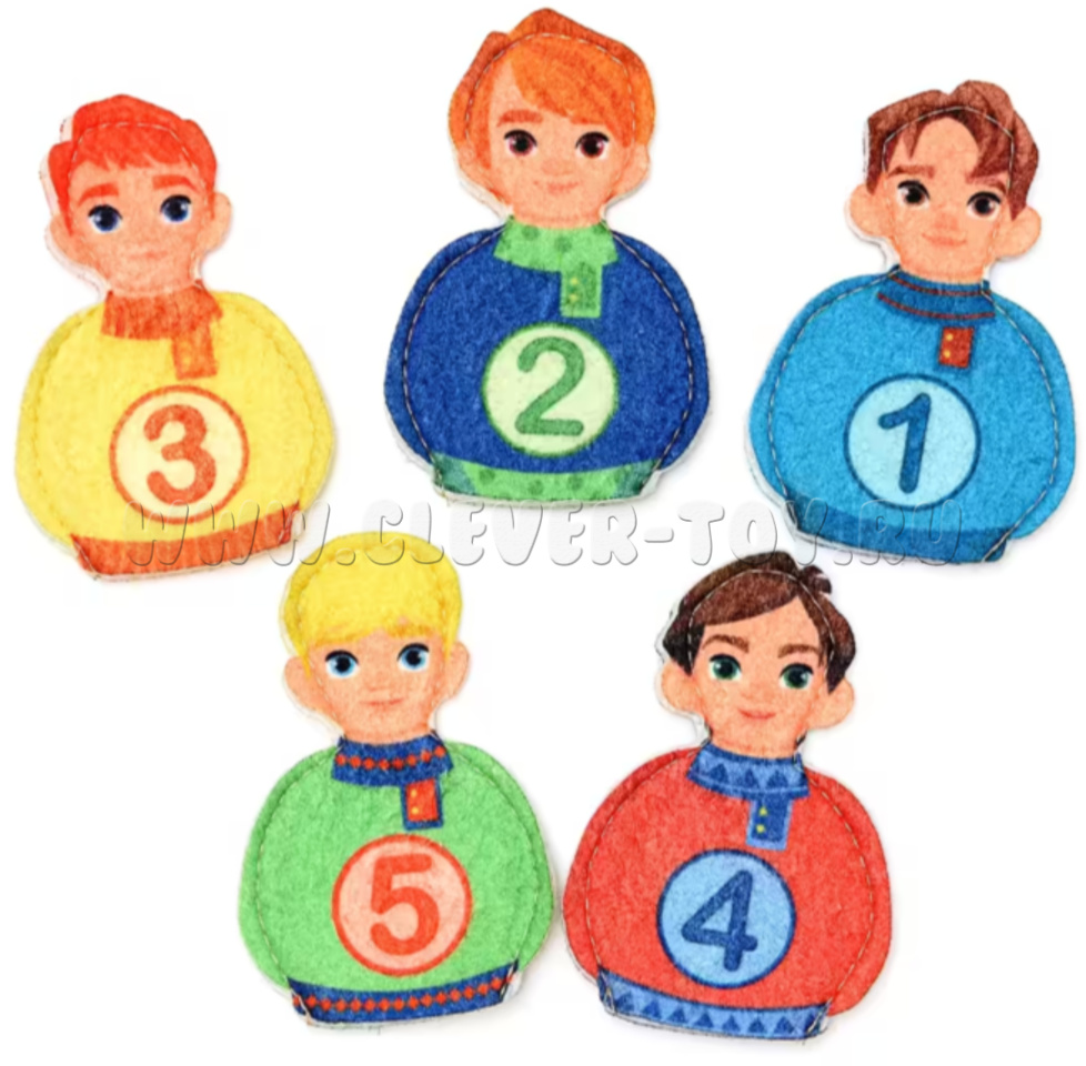 В набор входит: 5 фетровых фигурок с изображением мальчиков в яркой одежде с разными цифрами. Познакомьтесь с пальчиковым театром, рассмотрев и пощупав все фетровые фигурки. По очереди надевайте куколок себе и ребёнку на пальцы. Пусть малыш придумает каждому из мальчиков имена, какие блюда им нравятся, чем они занимаются, где предпочитают гулять, есть ли у них любимые игрушки и т.д.