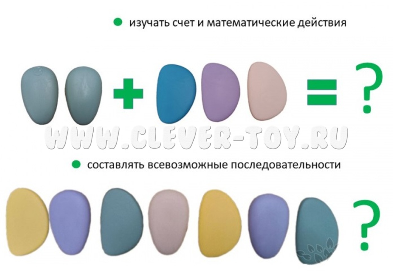 С помощью радужных камешков дети могут учиться считать и сортировать по определенному признаку, знакомиться с понятиями "цвет", "размер", "форма".
