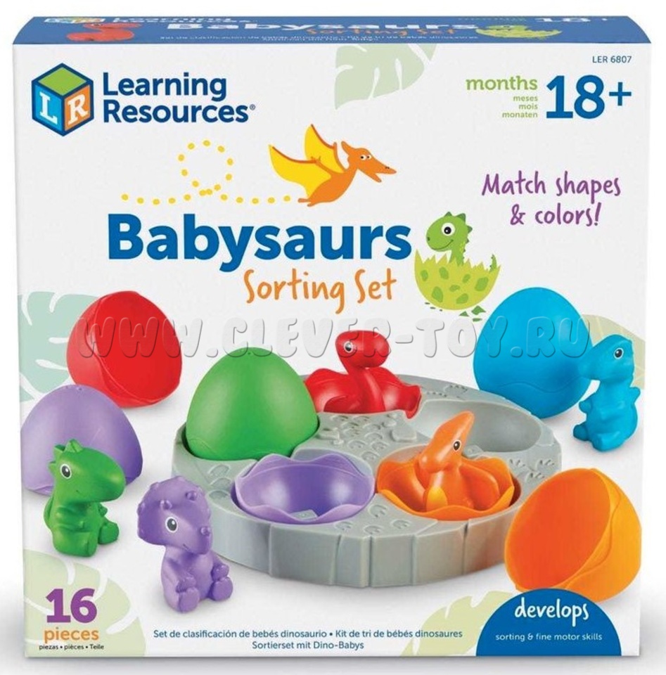 В этом гнезде 5 разноцветных яиц, внутри которых прячутся маленькие динозаврики. Малыш может познакомиться с ними, надевая их на пальчики, придумывая имена, подмечая различия между ними по форме и цветам, продумывая истории их взаимодействий и отношений. После игры для каждого детеныша нужно найти свой домик-яйцо, определив его по цвету. Сосчитать: все ли на месте?