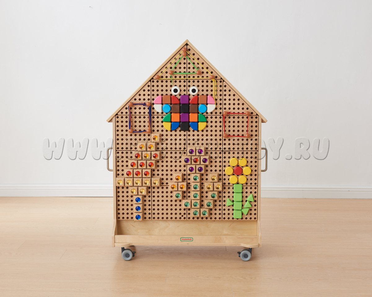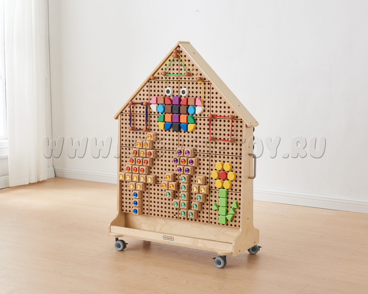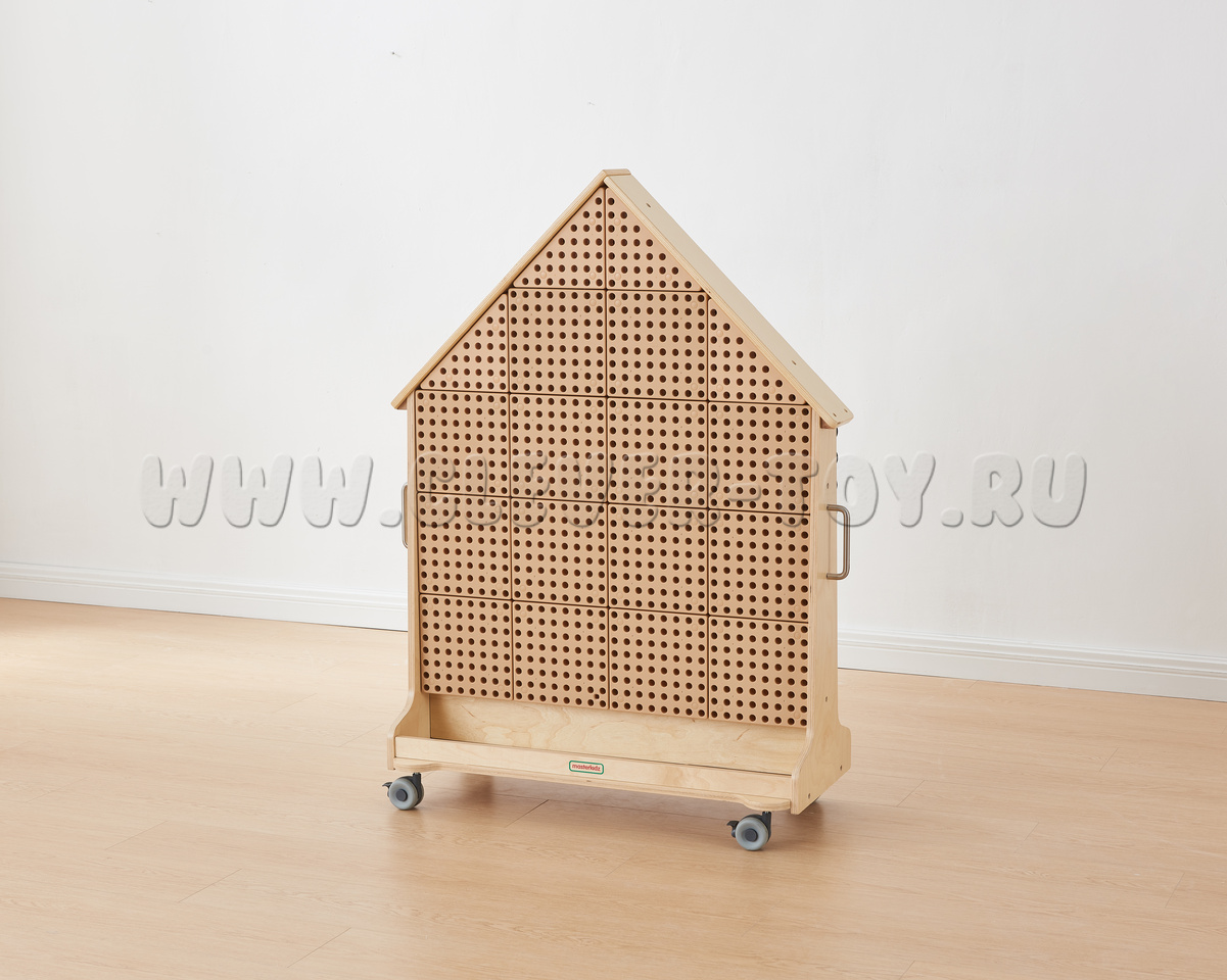 Представлена в виде передвижного вертикального основания в форме дома с крышей, подвижность которого обеспечивается 4 колесами. Основание выполнено из березовой фанеры, для монтажа образовательных наборов с двух сторон комплектуется пластиковыми панелями с круглыми отверстиями в количестве 36 шт. На боковых частях основания расположены 2 металлические ручки для удобства перемещения. В нижней части имеется полка для хранения.